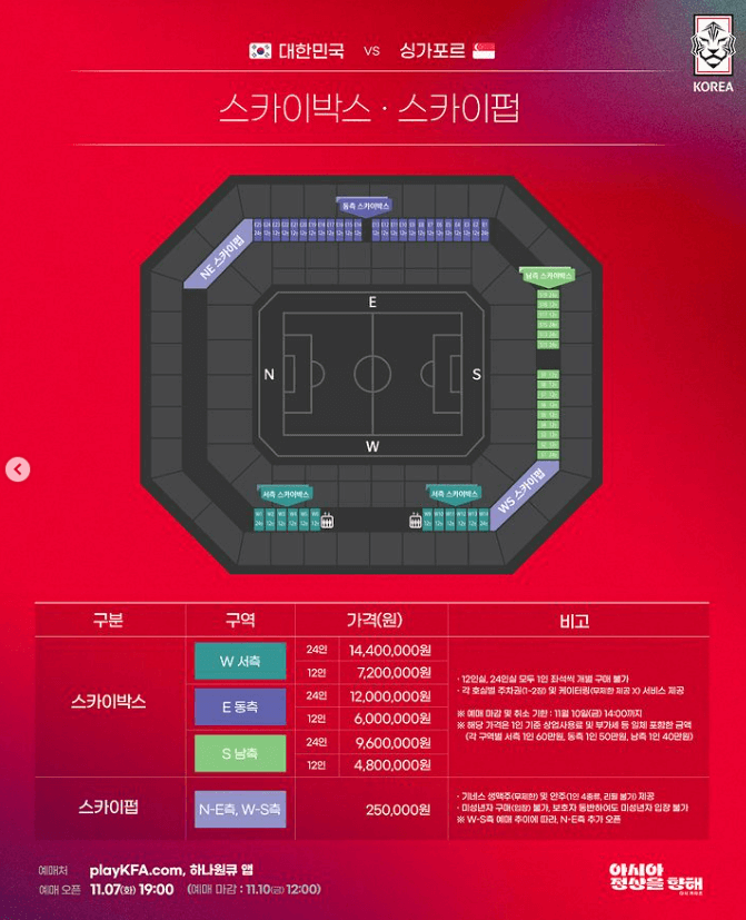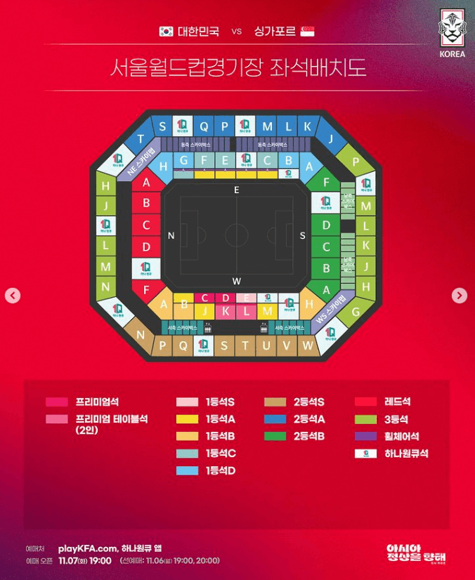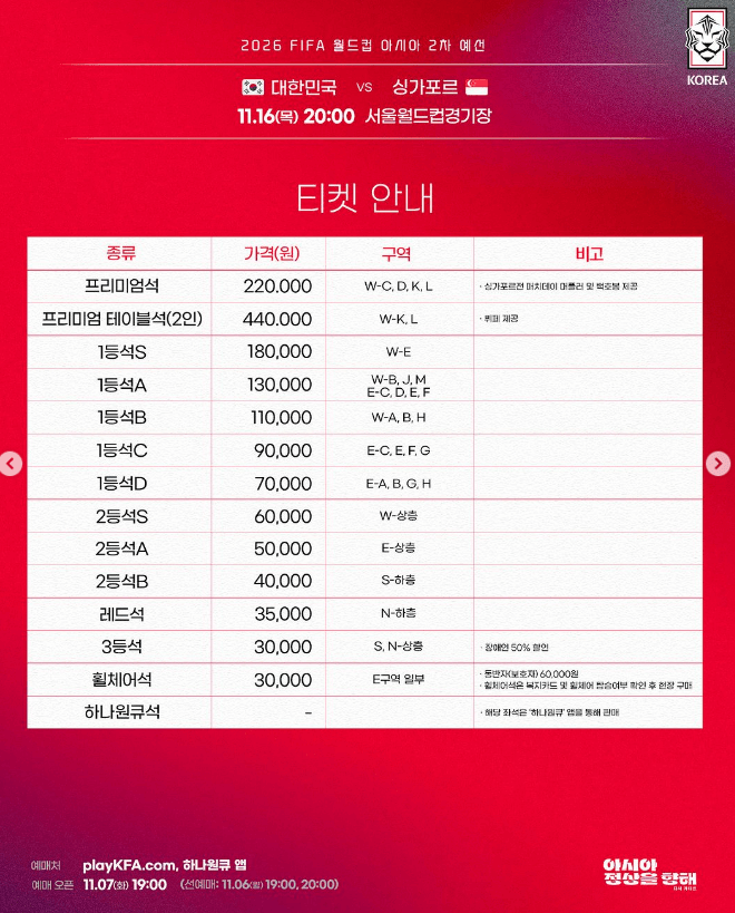 월드컵 예선전이 다가오고 있습니다. 11월 16일 20시 한국 대 싱가포르 경기가 서울월드컵경기장에서 진행될 예정이며, 티켓 예매는 7일 19시부터 더 레드 및 블랙 선예매는 각각 6월 19시, 20시부터 오픈될 예정입니다. 빠른 매진이 예상되므로 미리 내용을 숙지하셔서 예매 성공 하시길 바랍니다.