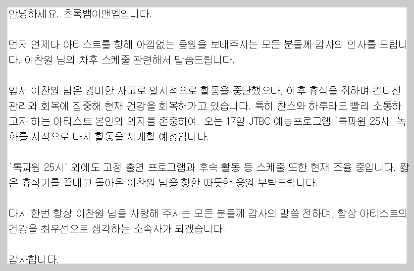 소속사인 초록뱀이앤엠은 17일 공식입장을 통해 이찬원이 휴식을 취하며 건강을 회복하고 있는 것을 확인하고, 이찬원 본인의 의지를 존중하여 오는 17일부터 예능프로그램 '톡파원 25시'를 비롯한 다양한 활동을 시작할 예정이라고 밝혔습니다. 또한, 다른 고정 출연 프로그램과 후속 활동 등에 대해서도 현재 조율 중이라고 하였습니다. 소속사는 이찬원을 환영하며 항상 아티스트의 건강을 최우선으로 생각한다고 말했습니다.