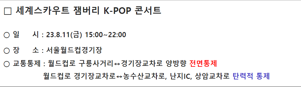 서울경찰청은 "11일 오후 7시부터 오후 9시까지 교통 혼잡 완화 및 주차공간 확보를 위해 세계스카우트 잼버리 'K-POP' 콘서트 행사장 주변 도로의 일반차량 진입을 통제할 것"이라고 10일에 밝혔습니다. 교통통제 시간은 행사 당일 오후 2시부터 행사 종료 시까지이며, 경찰은 오후 11시경 콘서트가 끝날 것으로 예상하고 있습니다. 경찰은 구룡교차로에서 월드컵경기장교차로를 양방향으로 차량진입을 제한하며, 경기장교차로에서는 농수산교차로, 난지 IC 및 상암교차로를 교통량에 따라 유연하게 통제할 예정입니다. 또한 강변북로를 진출입하는 차량은 월드컵지하차도로를 통행시킬 예정입니다. 경찰 관계자는 "교통혼잡으로 인한 시민의 불편을 최소화하기 위해 행사장 주변에 교통경찰 약 300명을 배치하고 교통안내 표지판 등을 설치하여 원격 차량 우회 안내 등 교통소통 관리를 할 예정"이라며 대중교통 이용을 권장하였습니다.