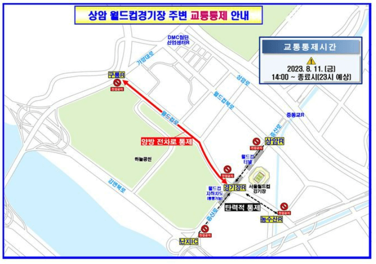 서울경찰청은 "11일 오후 7시부터 오후 9시까지 교통 혼잡 완화 및 주차공간 확보를 위해 세계스카우트 잼버리 'K-POP' 콘서트 행사장 주변 도로의 일반차량 진입을 통제할 것"이라고 10일에 밝혔습니다. 교통통제 시간은 행사 당일 오후 2시부터 행사 종료 시까지이며, 경찰은 오후 11시경 콘서트가 끝날 것으로 예상하고 있습니다. 경찰은 구룡교차로에서 월드컵경기장교차로를 양방향으로 차량진입을 제한하며, 경기장교차로에서는 농수산교차로, 난지 IC 및 상암교차로를 교통량에 따라 유연하게 통제할 예정입니다. 또한 강변북로를 진출입하는 차량은 월드컵지하차도로를 통행시킬 예정입니다. 경찰 관계자는 "교통혼잡으로 인한 시민의 불편을 최소화하기 위해 행사장 주변에 교통경찰 약 300명을 배치하고 교통안내 표지판 등을 설치하여 원격 차량 우회 안내 등 교통소통 관리를 할 예정"이라며 대중교통 이용을 권장하였습니다.