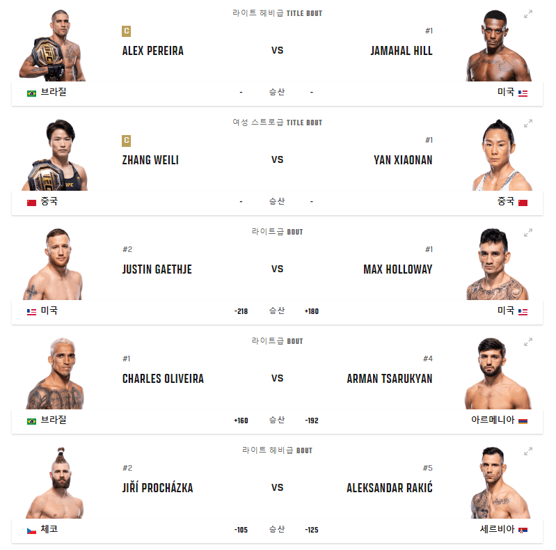 | 라이트헤비급 (타이틀) | 페레이라 vs 힐 |