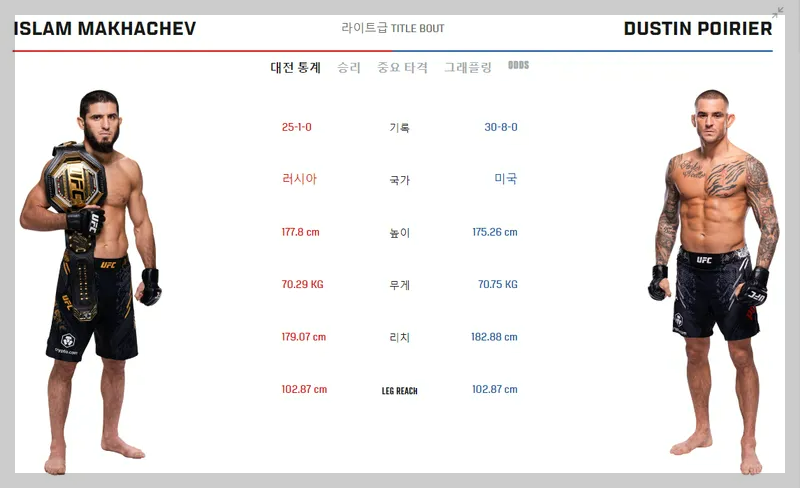 아래는 두 선수를 비교한 이미지 입니다. 이슬람 마카체프의 경우 1991년생이며, 국적은 러시아 입니다. 26전 25승 1패의 전적이 있고 키 178cm에 체중은 70kg, 리치는 179cm로 키보다 1cm가 깁니다. 현재 UFC 랭킹 라이트급 챔피언이며 P4P 1위 입니다.